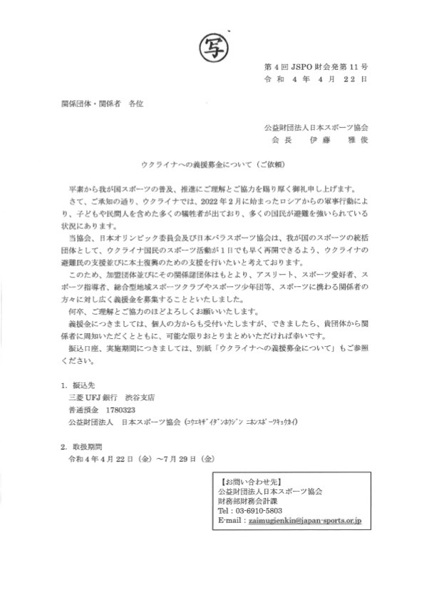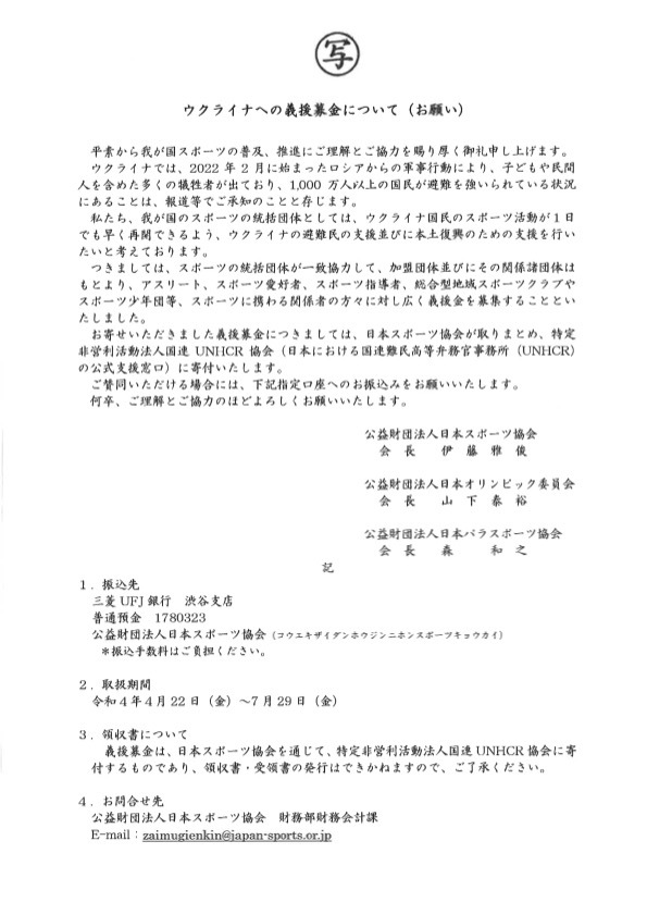 (公財)日本スポーツ協会より、ウクライナの義援募金の依頼が参りました。