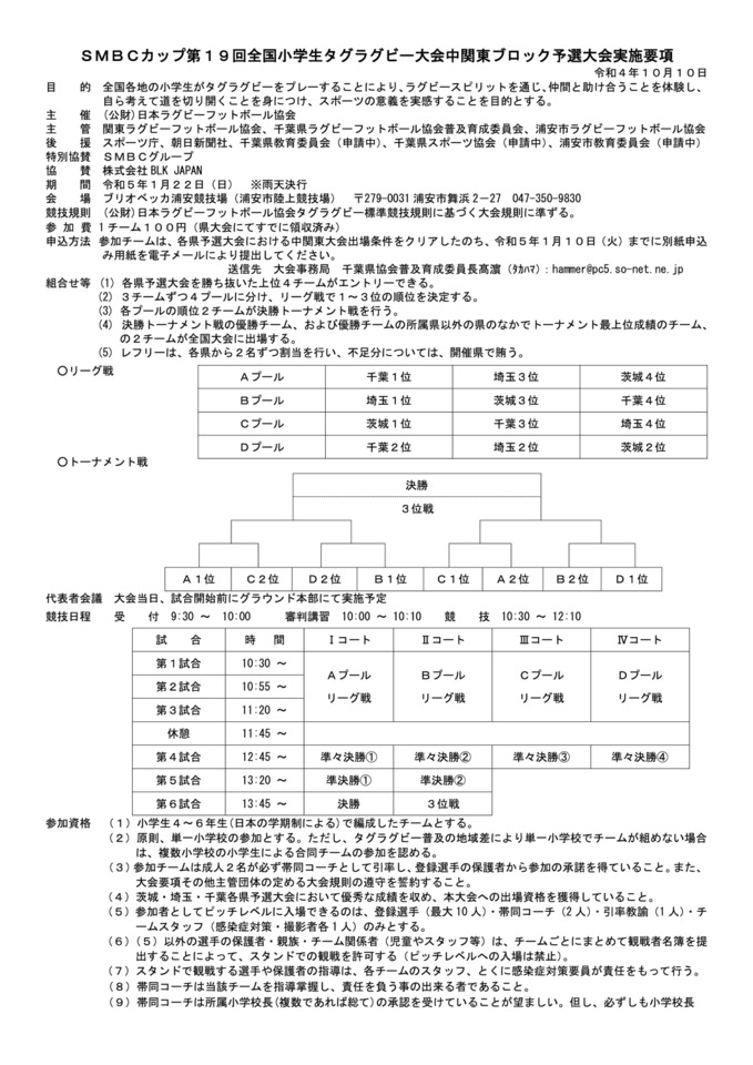 サントリーカップ第15回全国小学生タグラグビー選手権大会千葉県予選開催日程
