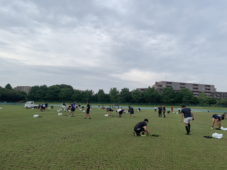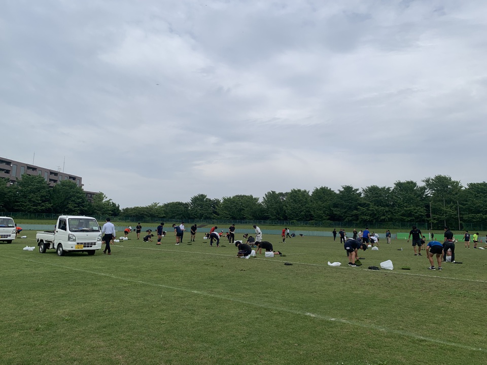 6月25日(火)に開催された「高校安全技術講習会」終了後、参加生徒のみなさんと顧問の先生方全員で、いつもお世話になっている天台グラウンドに芝の苗植え作業をさせていただきました。
