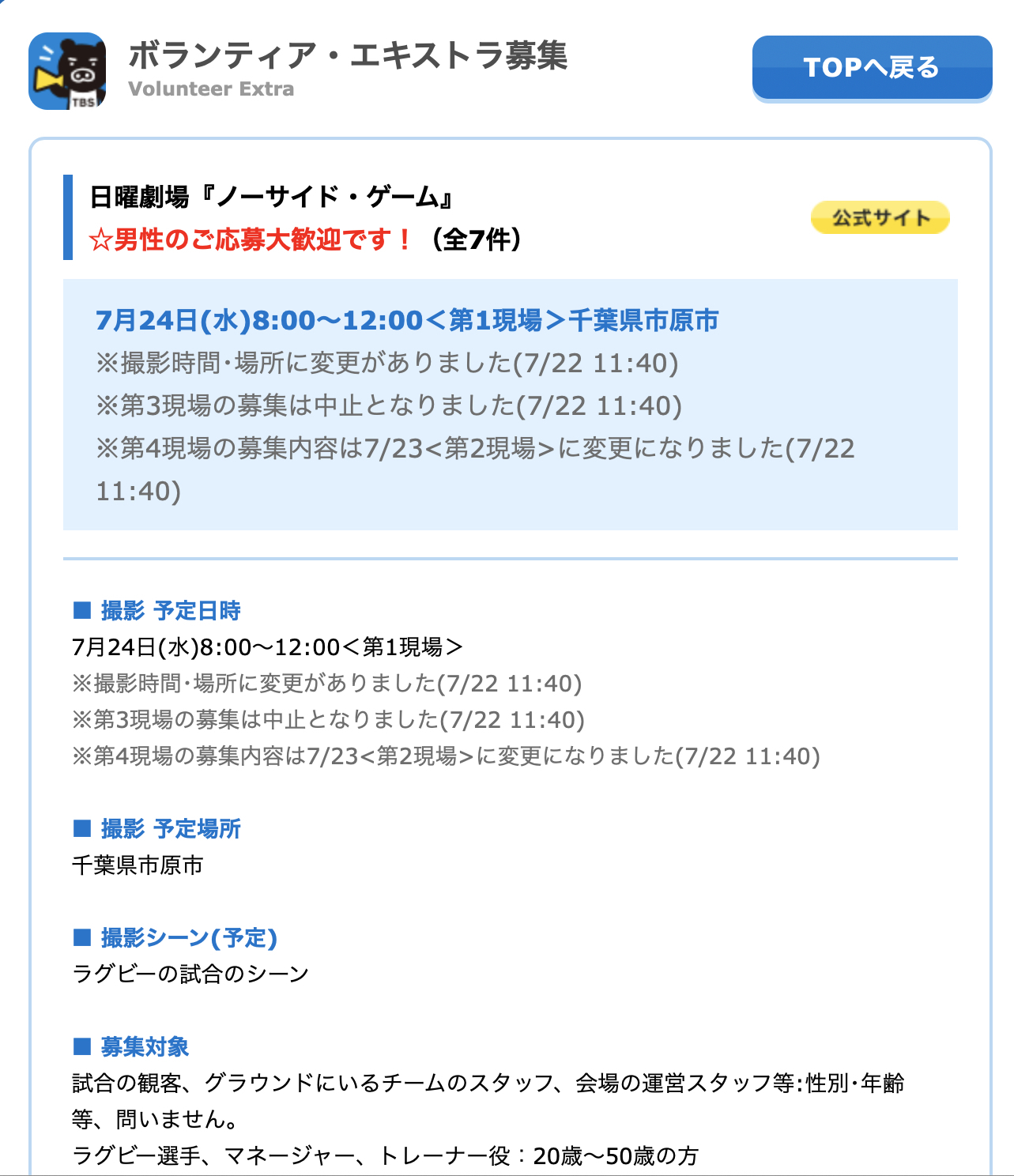 詳細:下記のTBS「ノーサイドゲームサイト」のエキストラ募集バナーをクリックしてご確認ください。