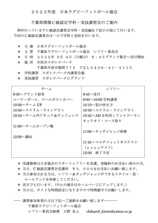 ※C級認定書費用は日本ラグビーフットボール協会のホームページから各自でお支払い。