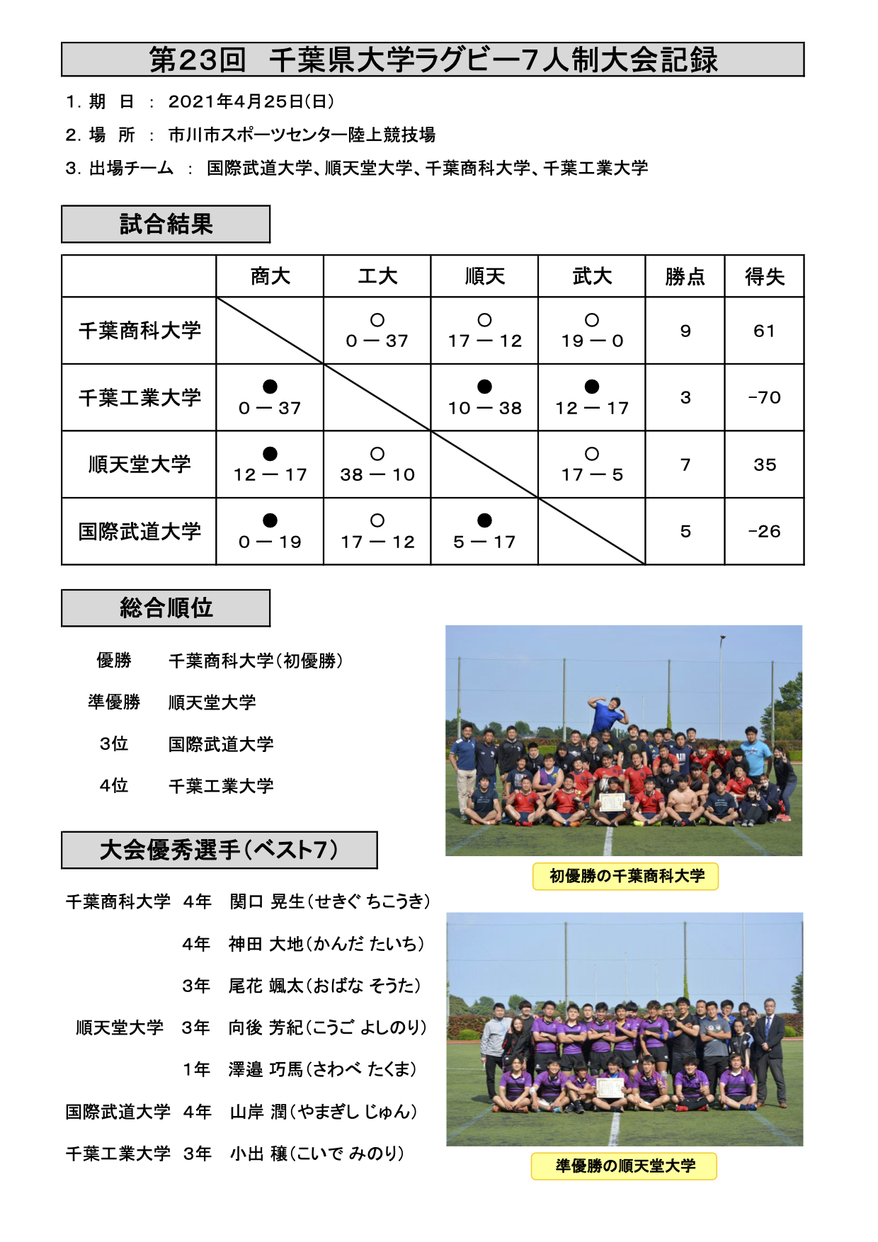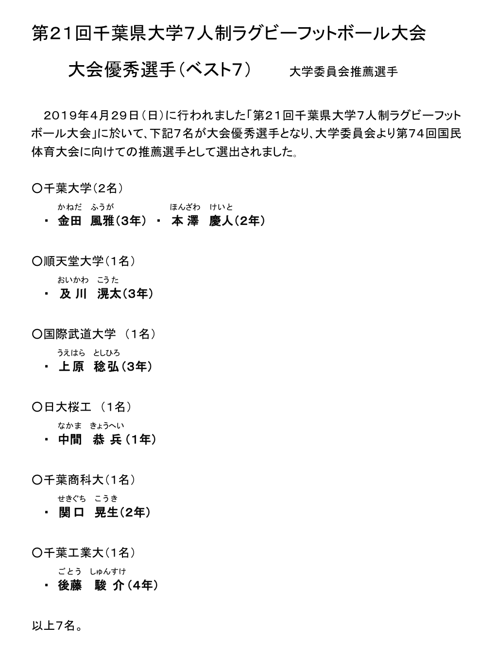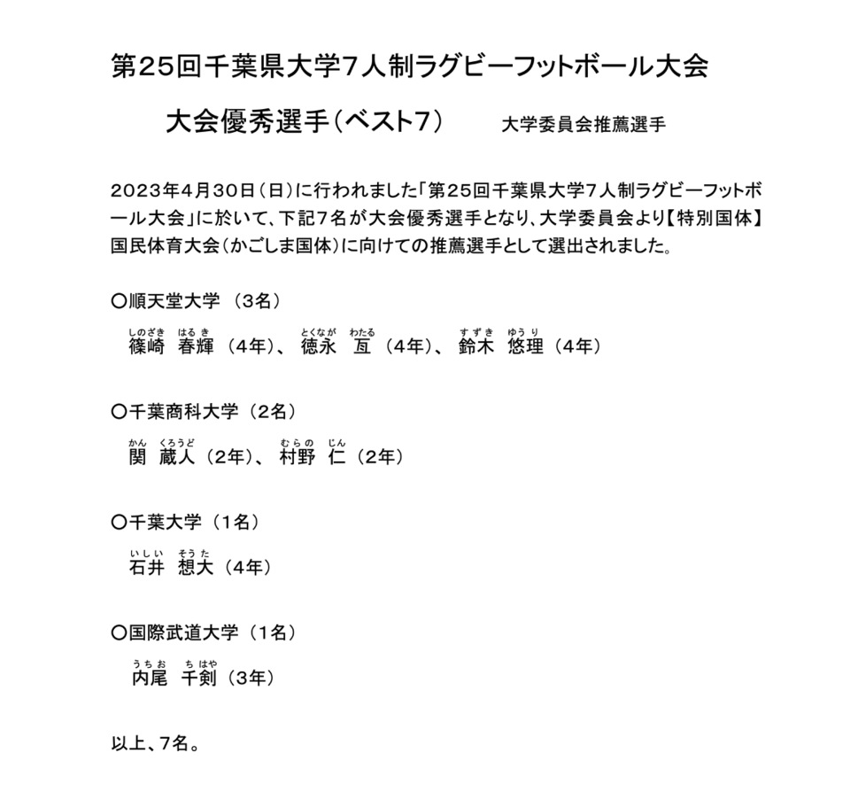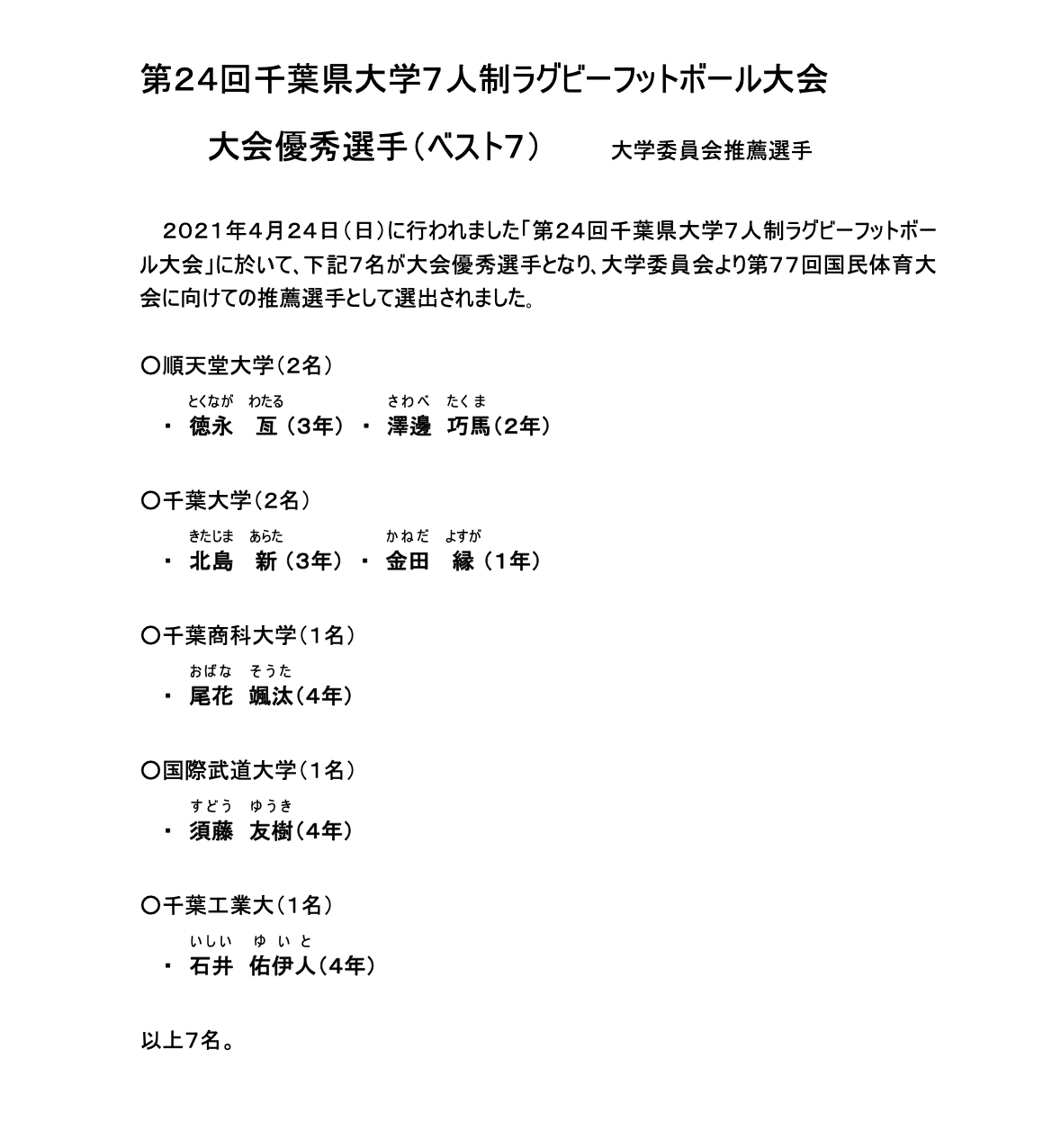 2021年4月25日(日)に行われました「第23回千葉県大学7人制ラグビーフットボール大会」に於いて、下記7名が大会優秀選手となり、大学委員会より第76回国民体育大会に向けての推薦選手として選出されました。