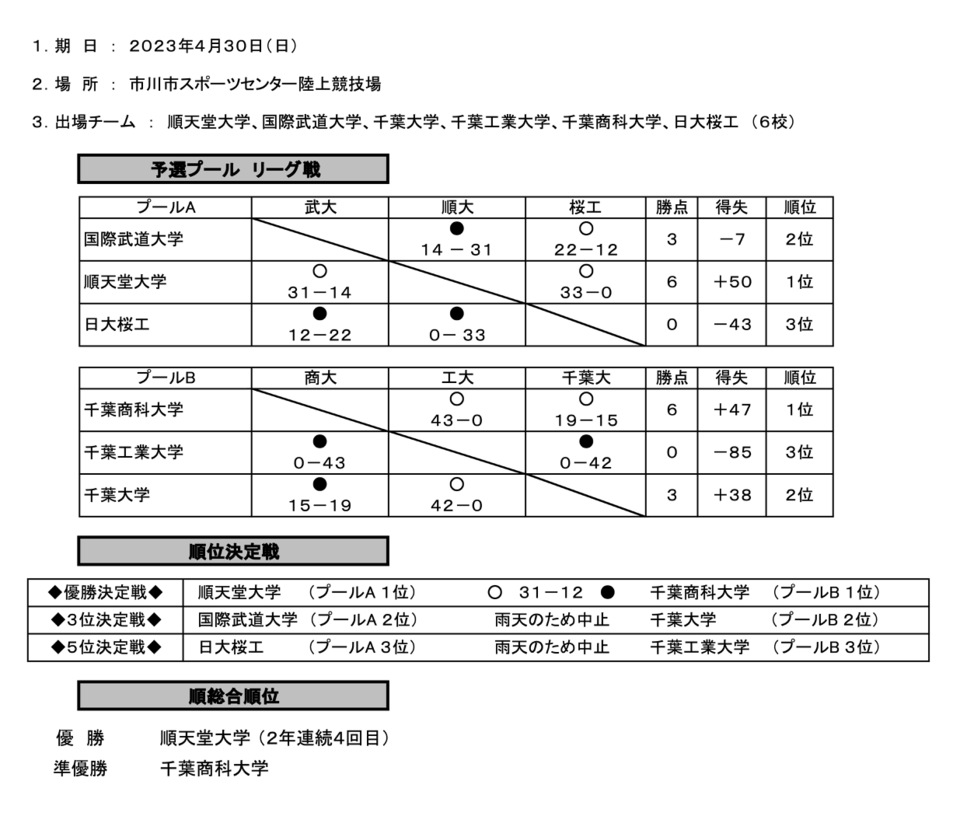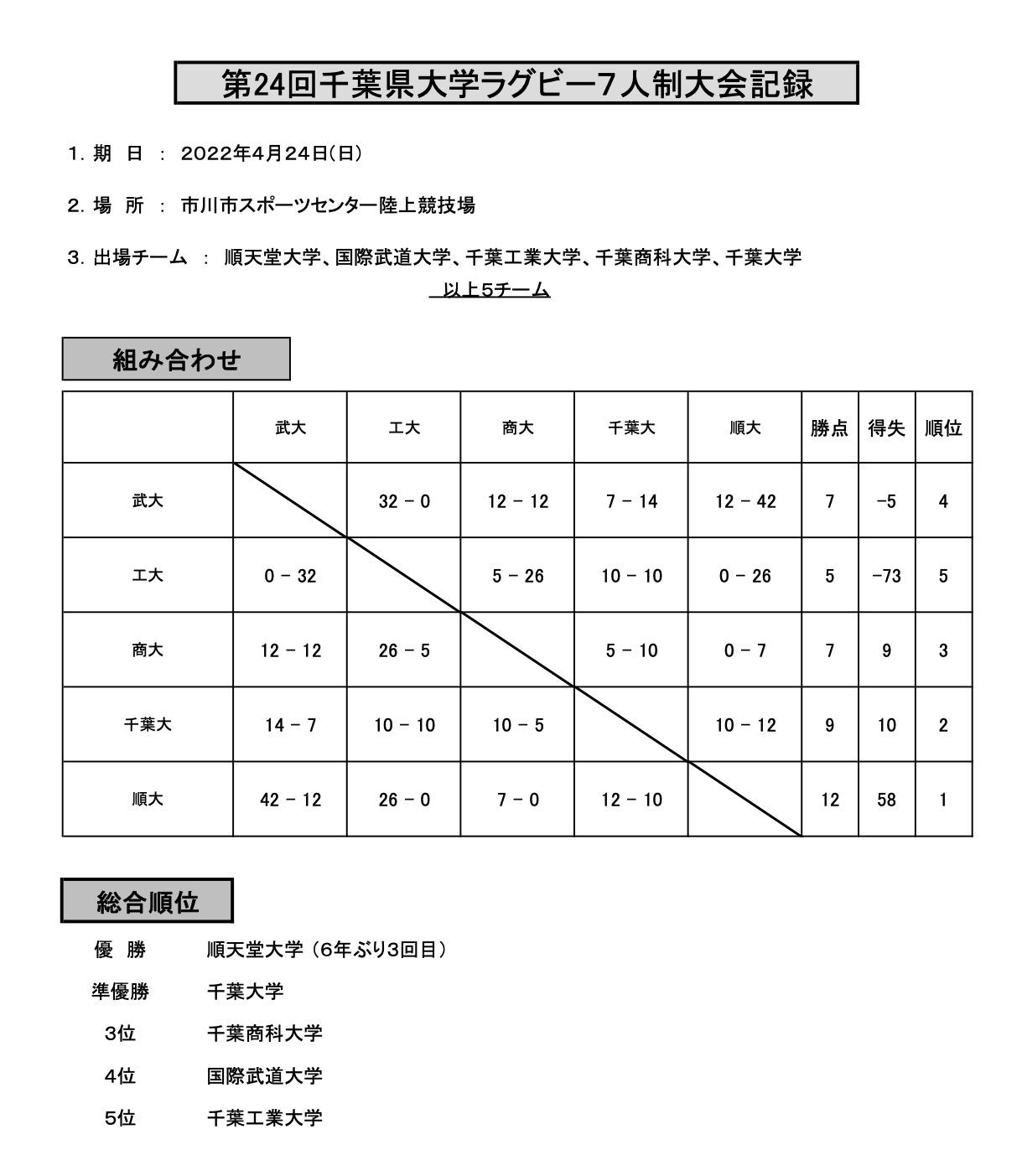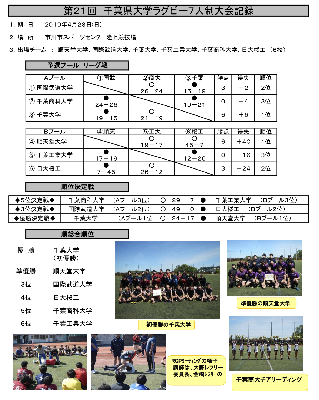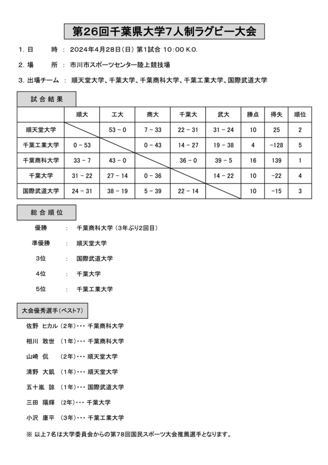 2021年4月25日(日)に行われました「第23回千葉県大学7人制ラグビーフットボール大会」に於いて、下記7名が大会優秀選手となり、大学委員会より第76回国民体育大会に向けての推薦選手として選出されました。